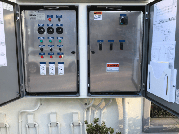 Sage at Cerritos is a new luxury apartment complex in Cerritos, California, a suburb of Los Angeles. Romtec Utilities provided two stormwater pump stations for this residential development aptly referred to as “big stormwater” and “little stormwater”. The big stormwater system pumps stormwater at 2850 gpm with 15 hp Ebara pumps in a triplex configuration. The “little” stormwater system operates at a discharge pumping rate of 23 gpm in a duplex configuration with ½ hp Ebara submersible pumps. Reliable level-sensing inside the 10’ diameter wet well is accomplished with an AST pressure transducer and NOLTA floats as redundant sensors. Electrical controls for the big stormwater system reside in a NEMA 4 painted steel enclosure while controls for the smaller system are placed in a NEMA 4X fiberglass enclosure.