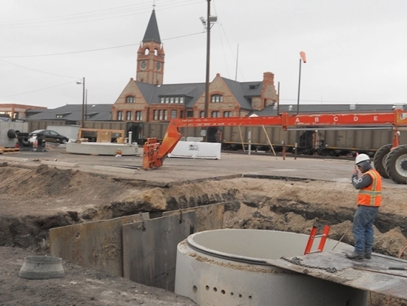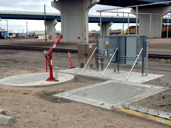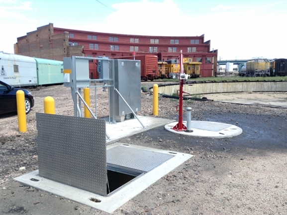 The Union Pacific Depot in Cheyenne, Wyoming needed two new stormwater pump stations to replace existing systems. The first station used Ebara 25 hp submersible pumps in a triplex configuration to handle stormwater runoff from a parking lot and additional drains. The second station used Ebara 7.5 hp submersible pumps in a duplex configuration to pump stormwater that drains from the pit of a railway turntable. Both systems include precast concrete valve vaults. Each vault was preassembled with Val-Matic Cam-Centric® plug valves, Val-Matic Swing-Flex® check valves, and Ashcroft pressure gauges. Both stormwater systems discharge into an evaporation pond that was installed as a part of this larger water collection replacement, which also included three additional Romtec Utilities wastewater lift stations.