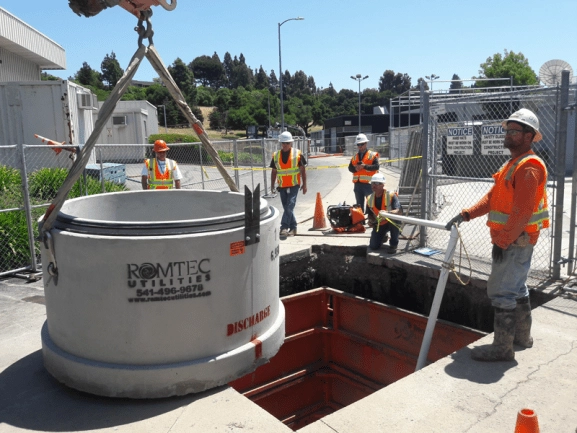 Romtec Utilities was hired to provide the design and supply of a new wastewater lift station for Pacific Gas & Electric Company (PG & E) in California. The new lift station needed to handle low flows of wastewater while meeting the design standards of PG & E. Romtec Utilities designed this lift station using design criteria (flow rates, force main length, and elevations) provided by BKF Engineers. This project moved forward once the lift station design was reviewed and approved. The installation of the system was then sent out to public bid and awarded to Roebbelen, the general contractor. Romtec Utilities delivered the system once the job site was ready and sent a delivery adviser to help the contractor identify components as they arrived.