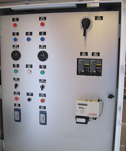 The food & drug store serving a nearby university needed this replacement package wastewater lift station for medium flow rates. Submersible solids handling pumps are designed to operate with suspended grease in the water from a cafeteria in the market. The lift station valves are vertically integrated into the sump discharge piping. An indoor UL listed control panel contains an intrinsically safe barrier for the in-well electrical controls, and an autodialer and basic alarm fulfill communication requirements. Floats are the primary and backup level-sensing control devices.