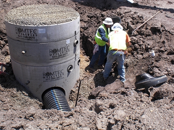 For the construction of the Solyndra campus, Soyndra chose to include two Romtec Utilities stormwater lift stations into its stormwater plans. Romtec worked in the design phase with Kier & Wright Civil Engineers & Surveyors, Inc. to specify designs consistent with Solydra’s goals for pumping requirements and appearance. Preston Pipeline was awarded the project, and Romtec Utilities submitted quotes for the specified lift stations. In order to meet Preston Pipeline’s budget, Romtec Utilities reengineered aspects of the lift station to be more economical, and Preston Pipeline submitted the Romtec Utilities design for approval. After Kier and Wright approved the designs, Romtec Utilities provided on-site construction advisors, start-up services, training, and a full system warranty.
