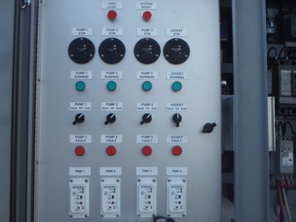 A new 144,000 square feet, two building industrial center needed a large stormwater pump station to handle the runoff from the site. This triplex system includes a fourth, “jockey” pump to handle low flow dry-season runoff. The three large pumps are 20 hp Ebara submersible pumps designed for redundant pumping during high flow events. A pressure transducer serves as the primary level-sensing device and operates inside of a perforated stilling well designed to prevent solids from interfering with the sensor. The electrical controls are configured with a logic relay, intrinsically safe circuits, and communications.
