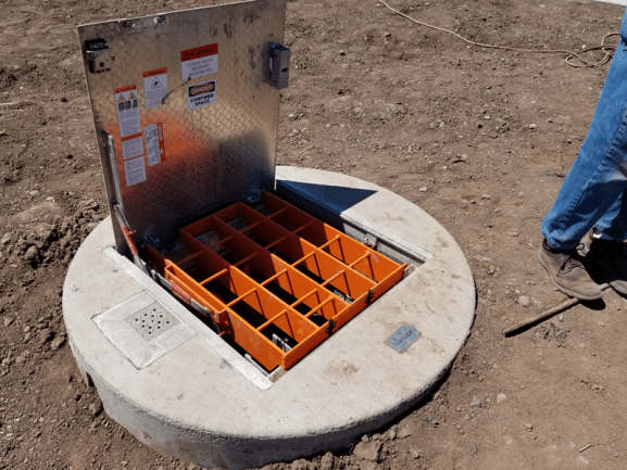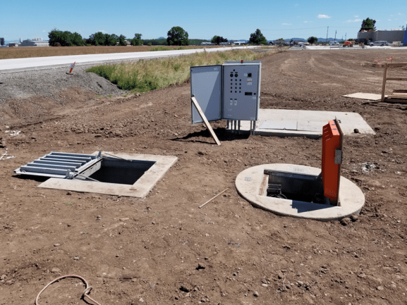 The construction of a food manufacturing facility in Junction City, Oregon required the installation of a wastewater lift station. The pump station handles wastewater from the building’s on-site restrooms and process water from the food production process. Romtec Utilities engineered this lift station with Ebara 5hp pumps installed in a duplex configuration. Wastewater levels in the system are detected and measured using an array of mechanical floats. Electrical controls in the system were designed by Romtec Utilities using an alternator controller. Controls were mounted inside a robust NEMA 4 painted steel enclosure and configured for specific parameters of this pumping application.