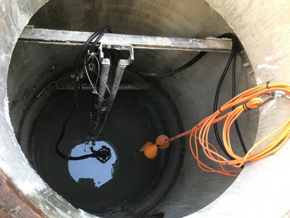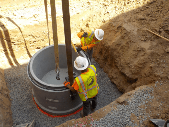 Romtec Utilities designed and supplied five stormwater pump stations for a new commercial development in Long Beach, California. All five of the pumping systems are nearly identical and are engineered with Ebara 2 hp submersible pumps. They are in a simplex configuration to handle intermittent, low-flows of stormwater. The slight changes in head requirements between the systems were resolved by trimming the pump impellers as needed to impact the pumping rate. Due to depth limitations onsite, each of the five concrete wet wells are 8’6” tall with a 4’ interior diameter. Nolta floats for level-sensing interface with electrical controls to provide reliable pump starts and stops on level inside the wet well. Additionally, all five control panels are located inside NEMA 4 painted steel enclosures for all weather protection.