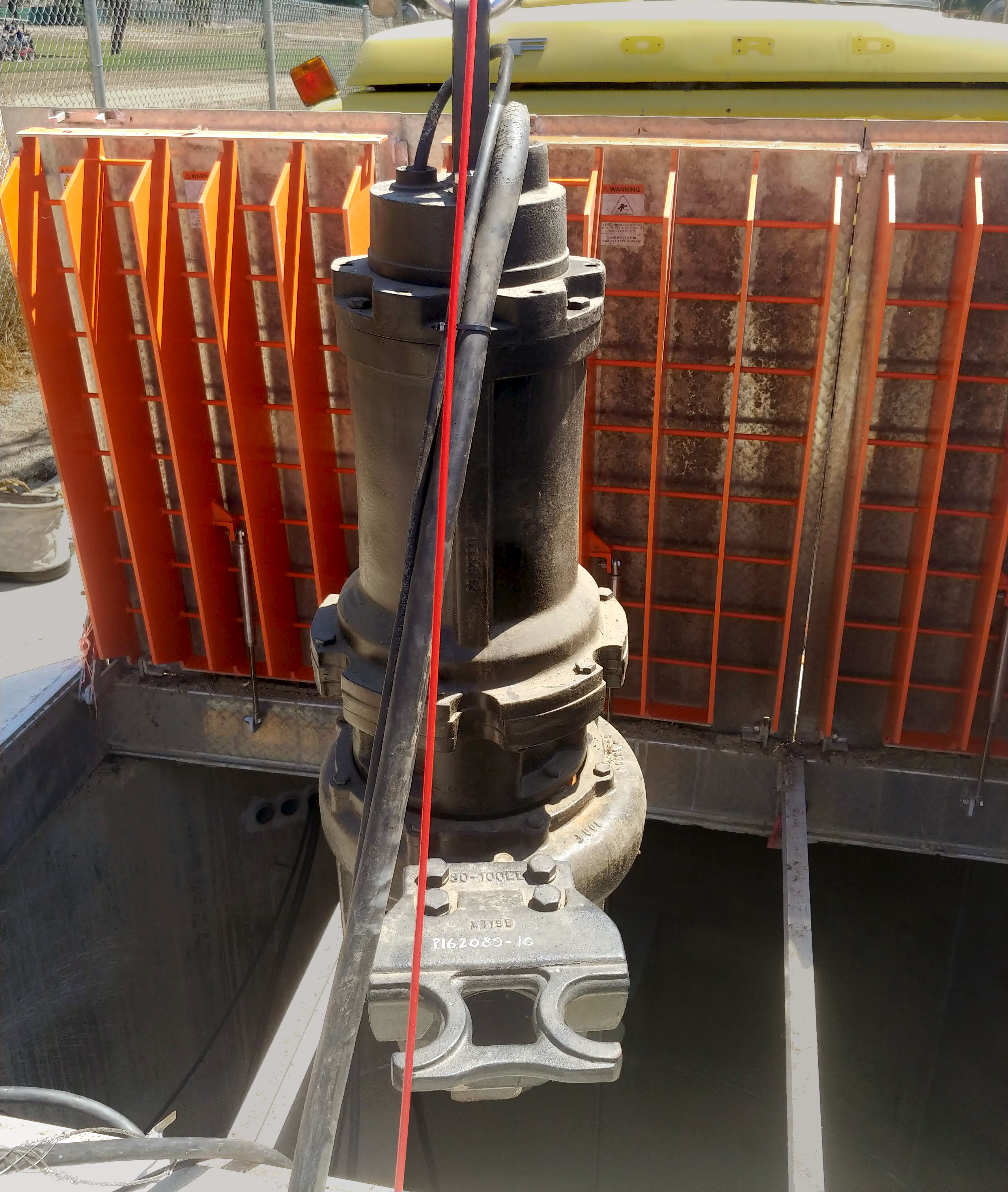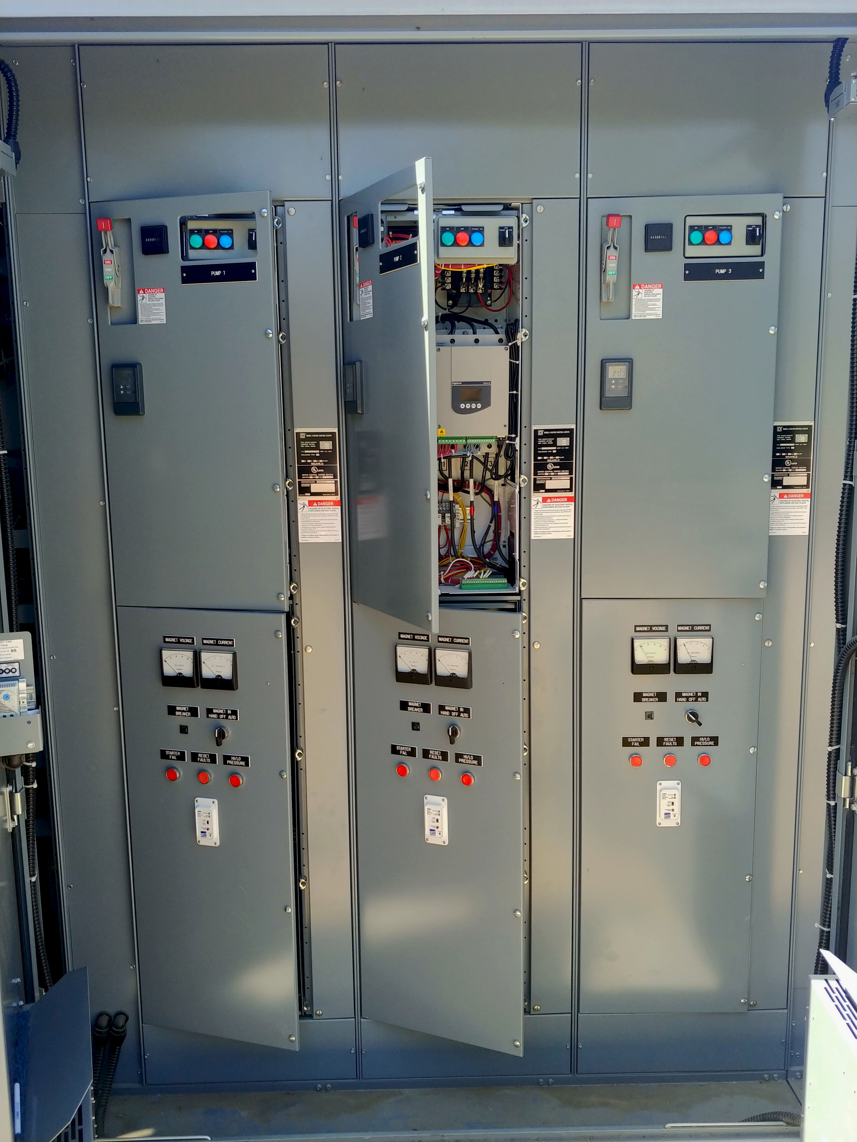 This project is a new lift station handling low flows in the Santa Ana Delhi Channel in Newport Beach, California. This system collects stormwater in a 10’ inner diameter (ID) wet well that reaches 32’ in depth. In the bottom of the well, three Ebara 20 horsepower (HP) submersible pumps sit ready to pump out the water. The pumps will be triggered by an AST4520 pressure transducer, which sits in the bottom of the wet well and measures the level of the water by determining the pressure of the water. When the pressure gets high enough from the rising amount of water in the well, the pressure transducer will send a signal to the controller for the pumps to start. It will also monitor the lowering pressure while the water is being pumped out, to ensure that when the water gets low enough the pumps will turn off.
