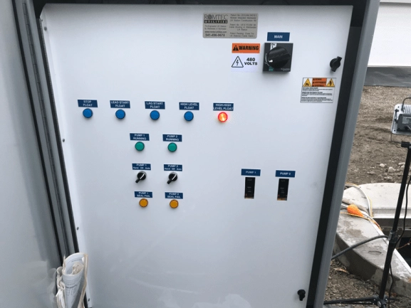 Romtec Utilities designed and supplied a stormwater pump station for a small housing development in North Bend, Washington. The pump station handles medium flows of stormwater using Gould submersible pumps with 1.5 hp motors. The system operational valves for the pump station were mounted to the interior of the wet well structure to meet the requirements of this site. During pump failures or other causes of system overflow, stormwater will drain to a catch basin located in an adjacent alley. A flashing alarm beacon is mounted to the front of the control panel enclosure for directly notifying local personnel when there is an issue with the system. Electrical controls use an alternator controller configured for this duplex pumping application.