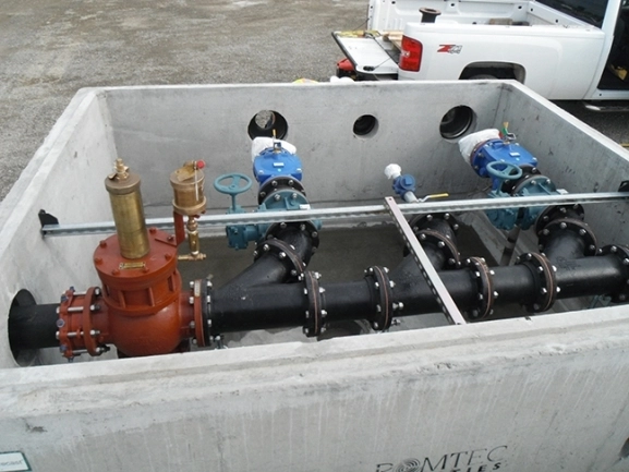 A large custom valve vault holds the complete 8” valve configurations with triplex discharge piping and force main headers.