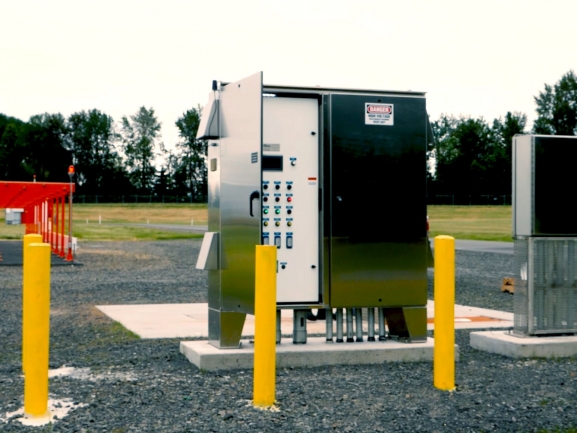 The Portland International Airport (PDX) needed a very large pump station to discharge high volumes of stormwater to a runoff creek from one of its runways. PDX has high groundwater tables due to its location near the Columbia River. Romtec Utilities met the high-volume, low-head requirements of this application by using 50 hp Flygt axial flow pumps. A 15 hp jockey pump was also included. These large pumps required large piping and operational valves measuring 24-inches in diameter. To reduce the construction lead times, Romtec Utilities engineered three individual, precast concrete vaults to contain each of the triplex discharge valves. The wet well was engineered as a rectangular panel vault that could be completely precast. Inside the wet well a pressure transducer provides the primary level-sensing method with a redundant NOLTA float. The system controls utilized a Micrologix 1400 controller with a PLC panel.