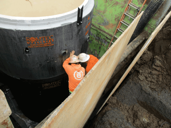 Romtec Utilities was hired to design and supply a wastewater lift station to expand the sewer infrastructure in Ridgefield, WA. The lift station was for an expansion of a commercial distribution center for United Natural Foods, Inc. or UNFI. Clark Regional Wastewater District, CRWWD, is the local water authority and needed to expand its sewer system for future residential development in this area of Ridgefield. To meet the needs of both UNFI and CRWWD, these agencies agreed to work together on a lift station that would meet the current needs of the UNFI expansion while also meeting the future needs of the District. Working as a private entity, UNFI employed their own engineers and consultants to oversee the project. ESI Design Services worked on this project as the site civil engineer, while PBS Engineering worked as the consulting engineering for the pump station site. Romtec Utilities coordinated with these organizations to design the lift station according to the unique requirements of this project. Tapani, Inc. was the installing contractor of the lift station. Once completed, Romtec Utilities sent a start-up technician to Ridgefield to commission the system and provide start-up testing and training services for this system.