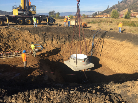 Romtec Utilities was hired to design and supply a wastewater lift station for an industrial development in Roseburg, Oregon. The property is in an ideal location in close proximity to train tracks and Interstate-5 and is suitable for a variety of industrial applications. Romtec Utilities began designing a lift station using design criteria supplied by i. e. Engineering, a local engineering firm. Additionally, we had extensive knowledge of the design standards of Roseburg Urban Sanitary Authority (RUSA), who would eventually own and maintain the system. Once the design was approved, Romtec Utilities sold the package system directly to Back Nine Development, the developer. The lift station was then installed by Cradar Enterprises, the contractor. A Romtec Utilities construction adviser was available at the job site to answer any questions about the installation of the system. Once construction was completed, the system was tested and commissioned by a Romtec Utilities technician using a backup generator as power was not yet available onsite.
