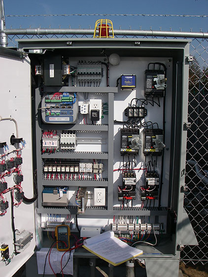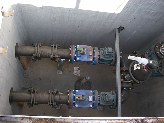 This package lift station is part of a sustained plan to expand the collection system of a large sewage treatment plant completed in 1999. The medium flow is handled by submersible solids handling pumps in a duplex configuration. A pigging port, plug valve, shut off valve, mechanical indicator, back flow actuator, and swing check valve are all contained in a below-grade valve vault. An outdoor control panel includes an autodialer for communications, conductive probes for level sensing, and an intrinsically safe barrier for in-well electrical controls.