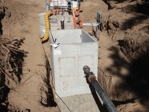 Republic Services, Inc. needed a new pump station to handle medium flows of wastewater in the form of treated leachate from its Sunshine Canyon Landfill. Precast concrete was used for the valve and meter vault and for the 21-foot-deep wet well structure. Along with robust hatches with fall-protection, the structural units were designed with a full-traffic rating. Two, 15 hp Ebara pumps were used to meet the pumping requirements. A separate meter vault was included to monitor the volume of treated leachate being pumped to the municipal water treatment facility. The electric controls comprised a UL listed control panel with floats for level-sensing and a NEMA 4X enclosure for outdoor operation with additional corrosion protection.
