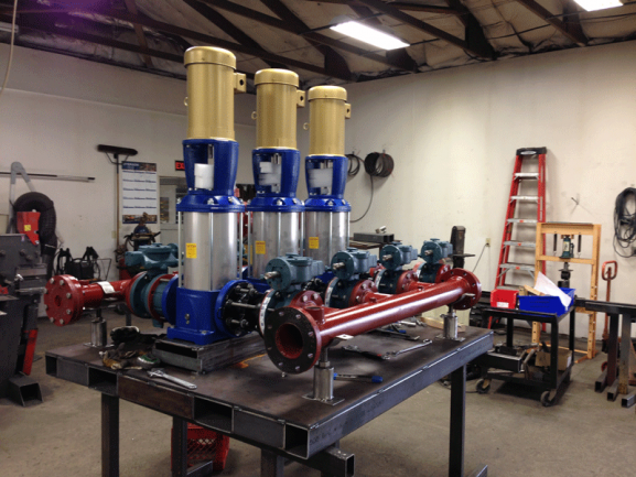 A new apartment complex required a booster pump station for maintaining the water pressure of potable water for the apartments. The booster station used 5 hp Goulds stainless steel, multi-stage pumps in a triplex configuration. Two pressure expansion tanks were included for maintaining pressure during pump cycles. Electrical controls comprise a Unitronics v350 PLC, Dwyer pressure sensors, and a NEMA 12 enclosure. This control panel was designed to sense and maintain water at a consistent pressure in a “closed loop control” configuration. Essentially as water is turned on and off throughout the 180 unit complex, the booster pump station “ramps up” or “winds down” to keep the pressure the same for each apartment.