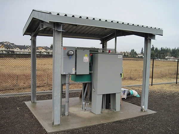 Romtec Utilities designs, engineers, and manufactures pump stations as complete packages designed for any project requirements. Control Panels are one of the most important components to a pump station and function as the “brain” of the system. These sophisticated electrical control panels often require reliable protection against many weather conditions. Direct sunlight, rain, and freezing temperatures outside of control panel enclosures can cause control panels to overheat or otherwise malfunction. Installing a shelter or shade structure at your pump station site is an effective way to prevent weather conditions from damaging the electrical controls of your pump station.